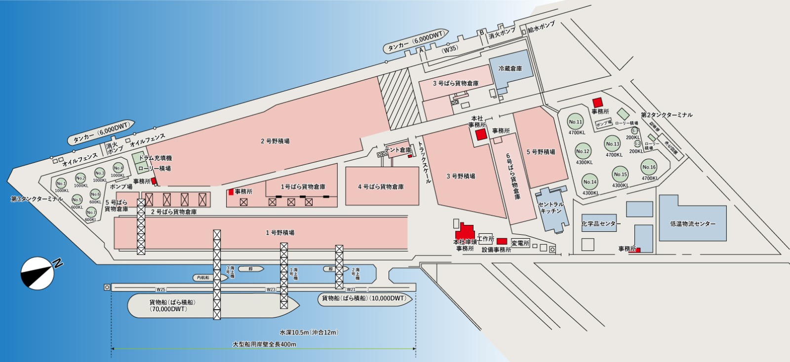 船舶からの陸揚げ陸下げだけでなく通関業務なども担うため、保税倉庫までを保有。